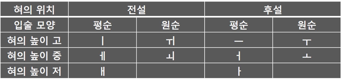 단모음은 '혀의 위치' '입술의 모양' '혀의 높이' 에 따라 나누어 지는데요.